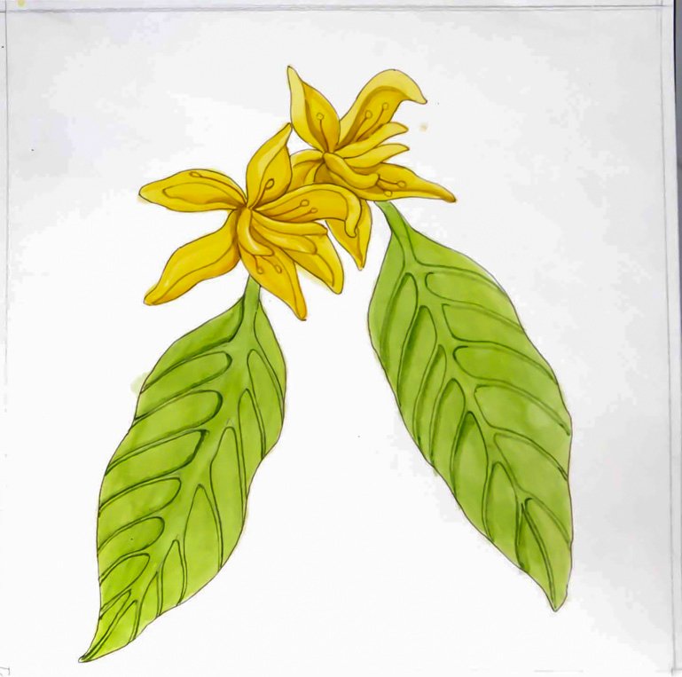 ChampakaHere is the leaf and flower of the golden champa (Michelia). Its fragrance makes it valuable for offerings, women’s hair ornaments, incense and perfumes. We have several trees here at the monastery.