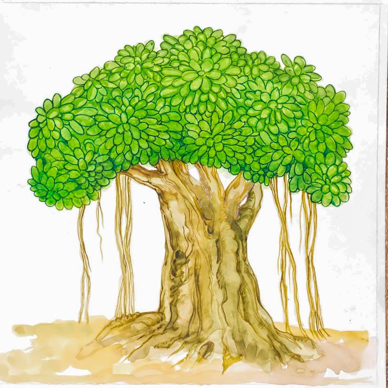 Banyan TreeThis is the banyan tree (Ficus indicus, or vata in Sanskrit). It symbolizes Hinduism, which branches out in all directions, draws from many roots, spreads shade far and wide, yet stems from one great trunk. There are several species of banyan near Iraivan Temple, some with important history.