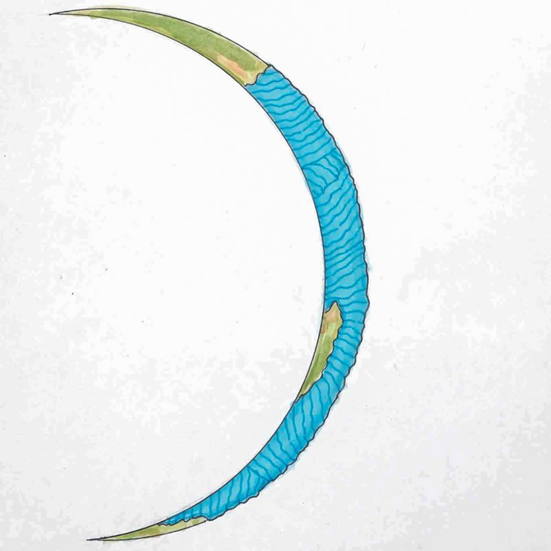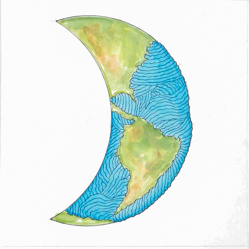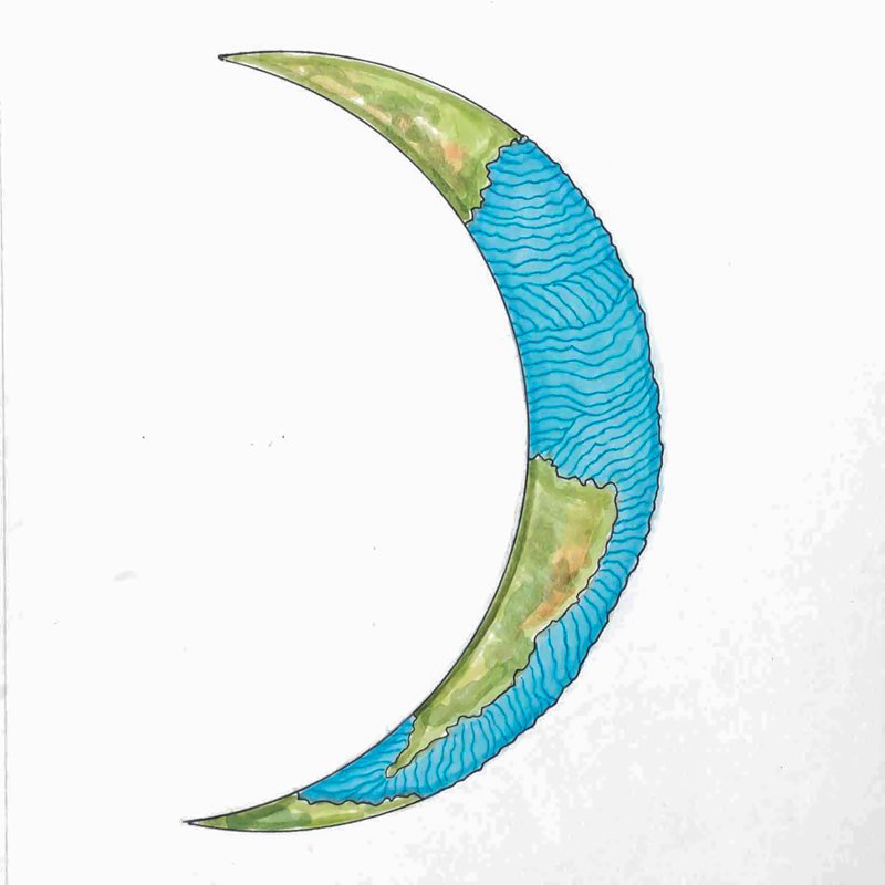 Dwapara YugaThis crescent Earth represents the Dwapara Yuga or “Age of Truth.” It is the third in the repetitive cycle of yugas, lasting 864,000 years, representing a time of diminishing spirituality.