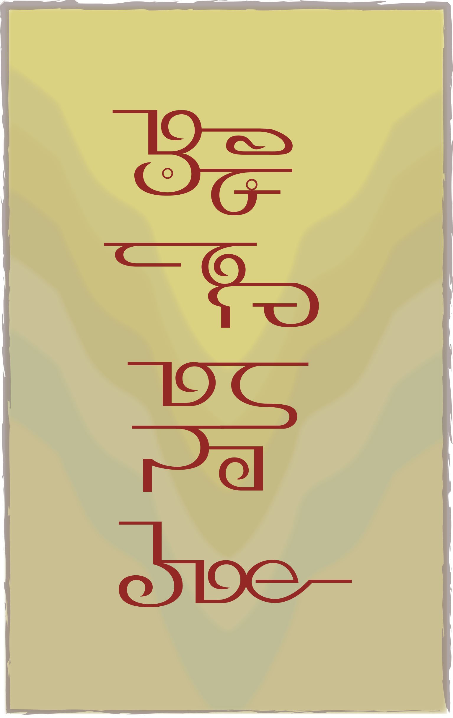 Controlling breathThis is Shum script for kalibasa, vumtyeudi, karehana, nikashum. It is a meditation in Gurudeva’s language of meditation and one of the 12 meditations he asked us to carve on the pillars. This is the January meditation. It begins with kalibasa, a pranayama or breathing discipline, using the diaphram to slowly inhale and exhale, using the breath to quiet the mind and balance the forces mentioned below. Vumtyeudi is the masculine-aggressive-intellectual current that flows up the spine, known in Sanskrit as pingala. Karehana is the feminine-passive current, the physical and emotional energy, known in Sanskrit as ida. Nikashum is the art of withdrawing the energy into the spine through the breath. By withdrawing awareness from external happenings and forces, true meditation can be achieved.