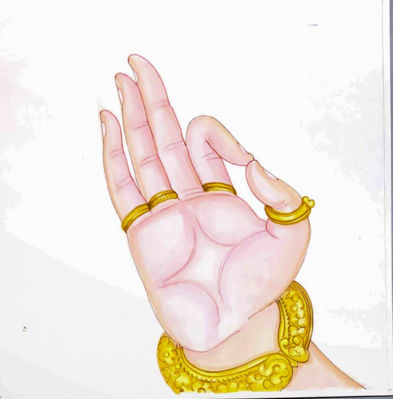 Jnana MudraThis hand gesture is called jnana mudra (also known as chin mudra and yoga mudra), in which the thumb and index finger touch, forming a circle, with the other fingers extended.
