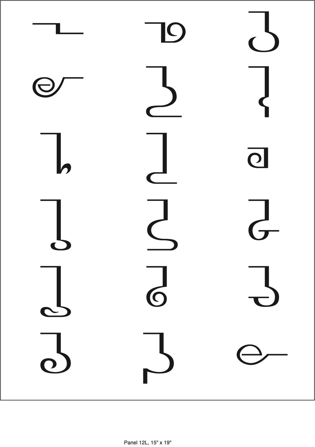 Basic Shum alphabetThis is the basic Shum alphabet—its first 18 letters and sounds. It is a meditation in Gurudeva’s language of meditation and one of the 12 meditations he asked us to carve on the pillars. The letters begin from the top of the left column: ee, mm, ing, ling, li, ni, ka, sim, vum, reh, tya, ah, bi, oo, na, si, di, shum.