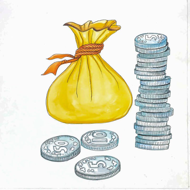 Artha, WealthArtha is wealth, represented here by a bag of gold nuggets and a stack of coins. Artha also has the meaning of utility and desire.