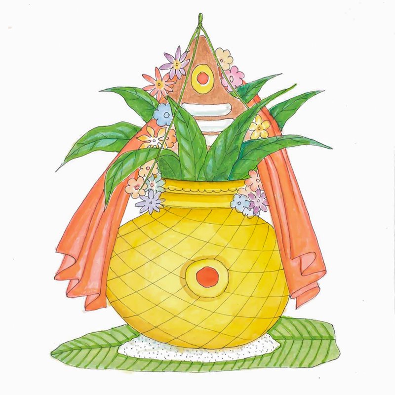 Offering PotKalasa is a water pot or jar. In temple rites, a pot of water, kalasa, topped with mango leaves and a husked coconut, represents the Deity during special pujas. Kalasa also names the pot-like spires that adorn temple roofs.